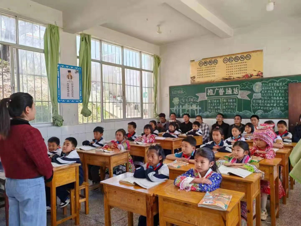 密通小学位于澜沧江畔,创建于70年代,是凤庆县唯一一所“彝汉”双语教学点。乡政协履职小组以“政协小组+学校+村党组织+学生+家长”的“五级联动”模式,“同上一堂课、同唱一首歌”,基层政协委员与学校老师、村干部、学生、家长代表共同学习了课文《吃水不忘挖井人》,共同歌唱《中华人民共和国国歌》,向孩子们讲解了学习推广普及国家通用语言文字运用的意义,提倡学生们在日常生活中要养成说普通话的习惯,并以小手牵大手的方式,引导学生家长通过学习运用普通话来畅通“彝语、土话”带来的交流阻碍,为少数民族同胞“走出去、说得好、吃得开”奠定语言基础。