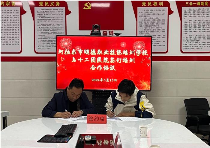 3月13日,第一师十二团医院(兵团南疆职业病防治院)与阿拉尔市明德职业技能培训学校“医校合作”签约仪式在十二团医院举行。学校李龙校长、培训业务部经理姚键,医院党支部副书记、院长安卫民等相关职能部门负责人参加签约仪式。签约仪式由安卫民主持。