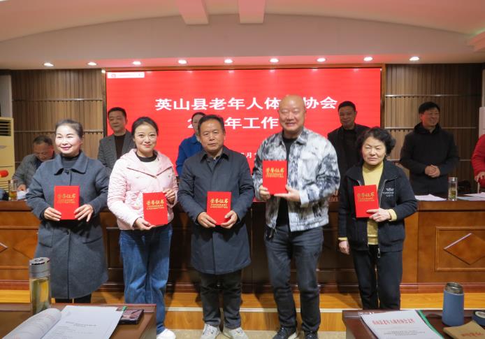 会议由县老体协副主席望东红主持。副主席叶之放、副秘书长胡颖(女)分别宣读了黄冈市老体协《关于表彰2023年度老年人体育工作先进单位、先进个人的决定》,英山县老体协《关于表彰2023年度老年人体育工作先进单位、先进个人的通报》,英山县老体协《关于吴彩萍等获得国家、省、市、县级社会体育指导员的通报》,英山县老体协《关于参加湖北省第六届“福寿康宁”系列赛事和黄冈市第六届运动会老年类体育赛事活动成绩的通报》。