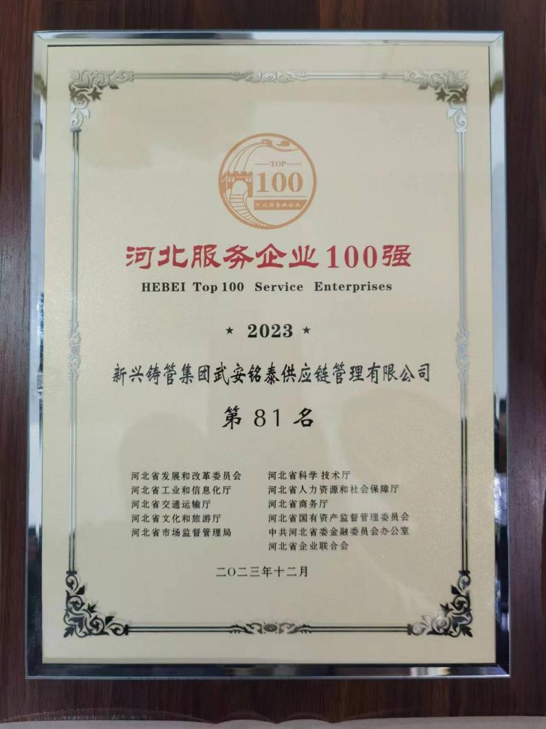 4月9日上午,河北省发展和改革委员会和省企业联合会等11家单位联合举办的2023河北服务业企业100强和创新领先50强发布会在石家庄市召开。新兴铸管武安铭泰供应链管理有限公司荣登“2023河北服务业企业100强”,名列第81。