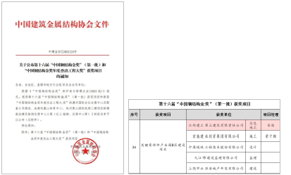 近日,中国建筑金属结构协会公布了第十六届“中国钢结构金奖”(第一批)和“中国钢结构金奖年度杰出工程大奖”获奖项目。由江西建工第三建筑有限责任公司(简称江西建工三建)承建的关键零部件产业园B区建设项目荣获中国建筑钢结构行业工程质量最高荣誉——“中国钢结构金奖”。
