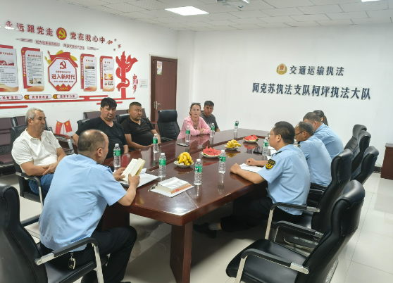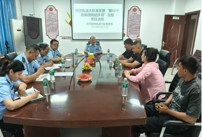 5月21日上午,阿克苏执法支队柯坪执法大队邀请5名结对亲戚到单位,每个人的脸上都洋溢着笑容。首先党支部书记向结对亲戚宣传党的二十大精神、习近平总书记关于加强和改进民族工作的重要思想以及习近平总书记关于铸牢中华民族共同体意识的重要论述,接下来大家一同观看民族团结微电影《石榴花开》。