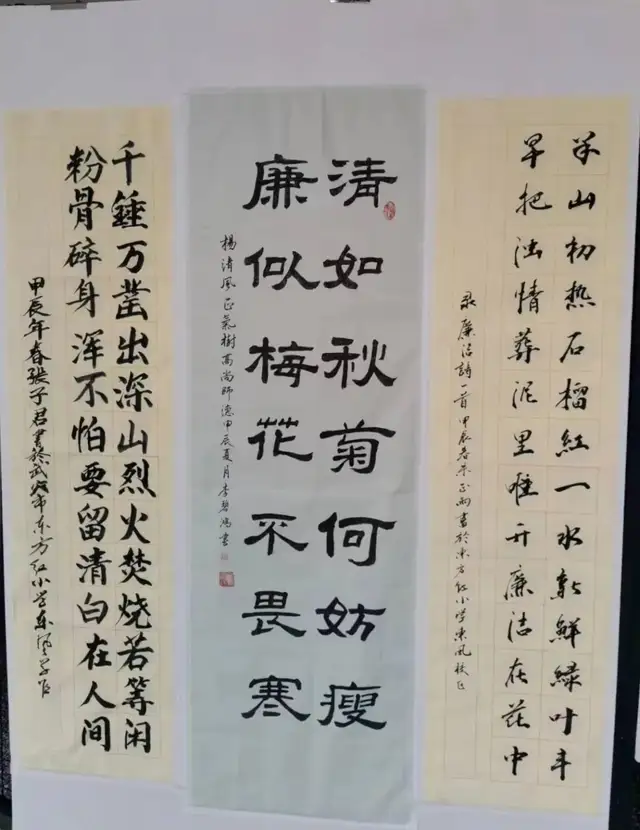 书法作品中,有的以楷书展现端庄严谨,字体规整秀丽,线条挺拔有力;有的行书如行云流水,自然流畅,富有韵律之美;还有的草书龙飞凤舞,气势磅礴,尽显豪迈洒脱。绘画作品的表现形式亦是丰富多样,有水墨画中那淡雅的山水,用简洁的笔触勾勒出深远的意境,墨色的浓淡相宜营造出独特的氛围;有彩笔画中那绚烂的色彩,生动地描绘出各种形象,素描画光影的细腻处理呈现出逼真的质感,扇子画作为一种特殊的书画形式,以其精致小巧、活泼多变的特点,给人以“小中见大”的艺术感受;而泥塑作品则以其浓郁的生活气息和真实生动的造型,赢得了大家的喜爱,充分展现了广大师生崇廉、尚廉、爱廉、敬廉、护廉的情操,营造了风清气正的教育生态。