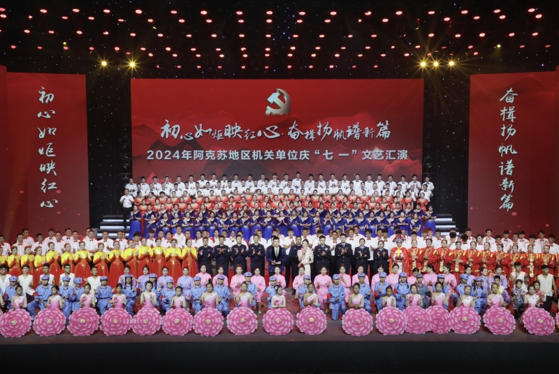 盛世华诞、同心向党。6月27日,地委直属机关工委主办的“初心如炬映红心·奋楫扬帆谱新篇”2024年阿克苏地区机关单位庆“七一”文艺汇演在地区融媒体中心举行,庆祝中国共产党成立103周年。阿克苏地委书记吴红展致辞并为光荣在党50周年的党员颁发纪念章。
