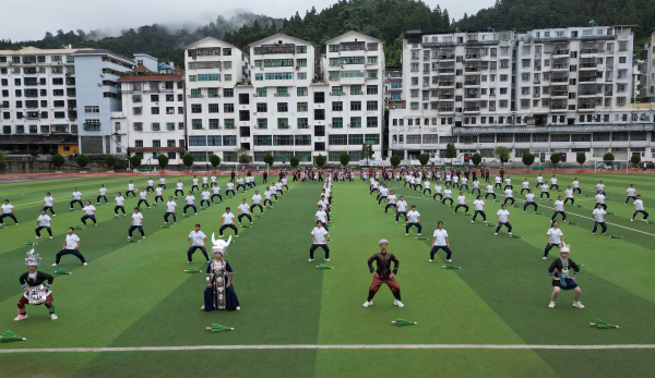 开幕式上,参赛运动员、教练员和裁判员们列队整齐,迈着矫健的步伐步入会场,随后举行了庄重的升国旗仪式。紧接着,县二中的学生们带来了一场精彩的非遗校本课间操《最美山水间》表演,展现了青少年们的青春活力和积极向上的精神风貌。
