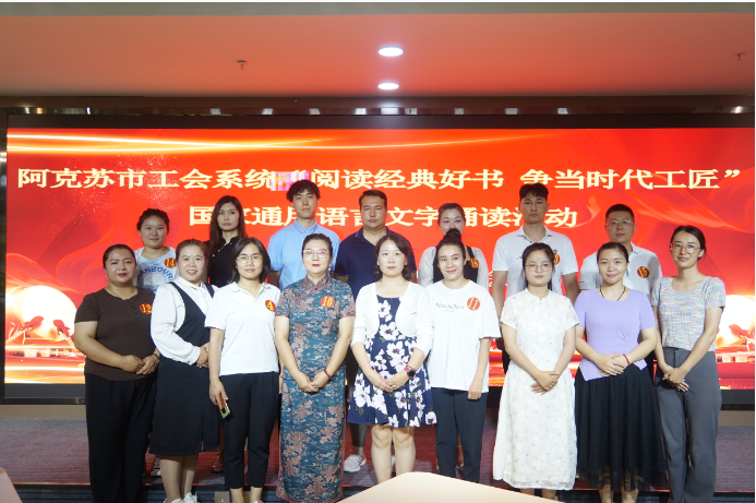 雅言传承文明,经典浸润人生!为深入学习贯彻习近平新时代中国特色社会主义思想,全面展现阿克苏市广大干部职工昂扬向上的精神风貌,提高广大干部职工弘扬爱国精神和增加主人翁意识,推广和普及国家通用语言文字,烘托学习党的二十大精神的浓厚氛围,6月28日阿克苏市总工会在新时代文明实践中心举办工会系统“阅读经典好书 争当时代工匠”国家通用语言文字诵读活动。