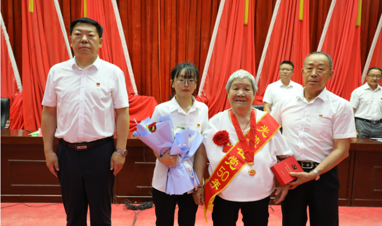 二团对“两优一先”即优秀党务工作者、优秀共产党员、先进基层党组织进行通报表彰,对一贯表现良好,党龄在50年的老党员颁发“光荣在党50年”纪念章,对他们忠于党,一辈子跟党工作,永远跟党走的信念深表赞许。新党员进行入党宣誓,老党员重温入党誓词,大家起立列队面对党旗、举起右拳,向党旗宣誓,既是对建党103周年的隆重纪念,更是对全体党员的一次深刻党性教育。