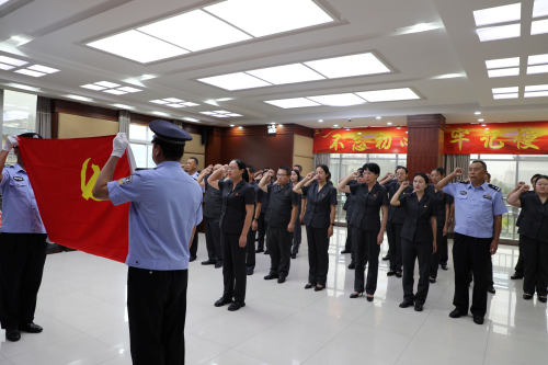 党员们庄严肃立,高举右手,面对党旗,在党组书记、院长黄海鸥的带领下重温入党誓词,回顾入党宣誓时的庄严承诺和坚定决心,激励干警不忘初心使命,永葆奋斗本色,严守党的纪律,立足岗位、扎实工作,以坚定的理想信念、崭新的精神风貌、饱满的工作热情投入到工作中。