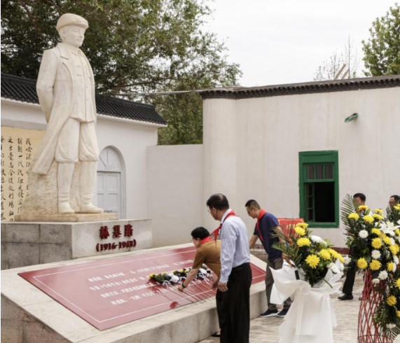 万里风犹正,百年旗更红。林基路烈士纪念馆内,林基路烈士雕像庄严肃穆。来自林基路小学的少先队员们为与会领导佩戴红领巾,大家瞻仰烈士雕像,仪仗队向林基路烈士敬献花篮,与会领导依次敬献鲜花。大家面对着鲜红的党旗,重温入党誓词,传承中国共产党人精神谱系,在新时代新征程上坚定理想信念,勇于担当作为。林基路烈士家属代表向林基路烈士表达了深切思念和缅怀之情。