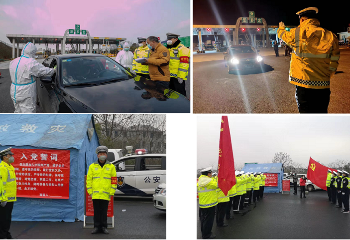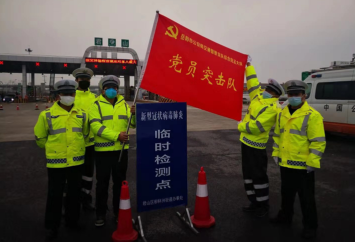 在许广高速巴陵、岳阳东、云溪出入口;在杭瑞高速君山、许市、冷水铺出入口;在京港澳高速岳阳东出入口,7支抗疫“党员突击队”队长,从支队党委书记、支队长易昊手中接过队旗。全体队员斗志高昂,大家纷纷立誓言、表决心:“坚决遵照党中央的指示精神,一线忠诚履职、坚决不辱使命、疫情不退决不撤岗!”至2月4日,众志成城的岳阳交警投入警力11615余人次,检查车辆179239辆,协助检查司乘人员339928人;其中劝返车辆9095台,劝返人员17146人,鲜红的党旗高就飘扬在全市57个防疫检查岗。