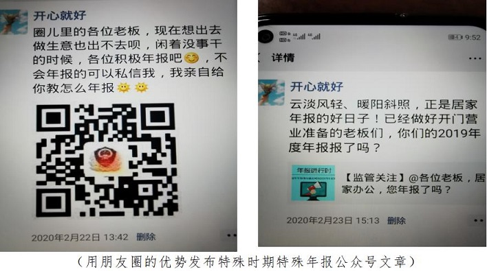 一方面在疫情期间运用朋友圈的优势发布特殊时期特殊年报公众号文章,提醒经营者宅在家中运用手机、互联网等做好年报工作。