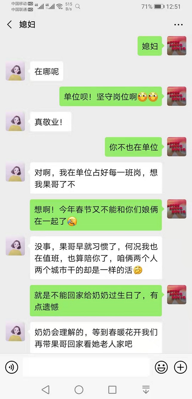 同一片天空、同一场战“疫”、同一份守护,韦川和张媛这对“双警夫妻”,在不同城市、不同岗位,忙碌在平安战“疫”第一线,他们为了更多家庭的幸福团圆奋勇前行。他们相互理解、相互鼓励,他们的这一份爱情中包含着夜以继日的坚守、聚少离多的酸楚和舍小家为大家的奉献。并肩战“疫”,同行有你,静待花开,平安归来。