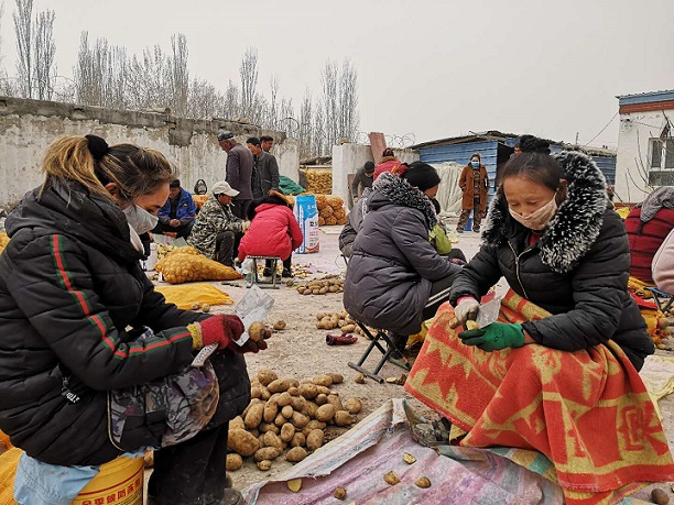 家里的妇女也不能闲着,种植大户陆续开始农业生产,用工进入高峰,村里组织妇女给种植大户切洋芋,备种子,院子里满是劳动的身影,一片忙碌。麦热比亚木·沙吾提是乌鲁木齐职业学校的一名学生,因疫情防控暂未开学,听说租住在邻居家种植洋芋的大户需要零工,她也要试一试,一天90元,早上9:00来,晚上20:00回,中午有1小时吃饭时间,今天她是第四天上班,她说:“工作不累,自己能承受,就在自家门口,工资一天一结算,在没有接到开学通知前,她要坚持在这里打零工,挣些学费、生活费,减轻父母的负担”