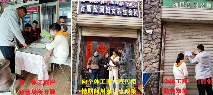 另因疫情影响,存在还未开门营业的个体工商户,为了让符合条件的个体工商户能够及时享受到疫情期间用水优惠政策,公司职工在抄表时,在其商铺门口张贴通知单,提醒商铺经营者享受疫情期间优惠政策的文件及期限,同时留下工作人员的电话,如开门营业尽快与我公司联系,我公司在派工作人员前去抄表登记。