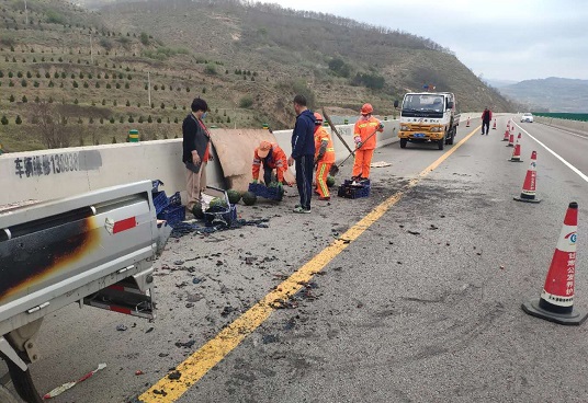天水公路局高养中心巡查发现后,第一时间组织养护企业人员车辆赶赴事发现场,迅速摆放警示锥桶,安排养护职工配做好后方车辆的安全示警和交通疏导工作,严防二次事故。同时为最大限度挽回当事人的货物损失,养护人员把没有发生损坏的瓜果整理后全部搬运至车厢内,并立即开展作业,清理路面洒落的瓜果和塑料筐等杂物。