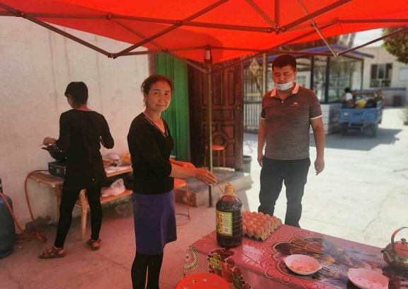 在温巴什乡尤喀克温巴什村,访惠聚干部田萍与机关干部艾尔肯•尼牙孜、阿依古丽•买买提看望慰问了包联户,送去了生活用品,还组织妇女委员为子女不在身边五保户做凉面、炸馓子,送上了节日的祝福。