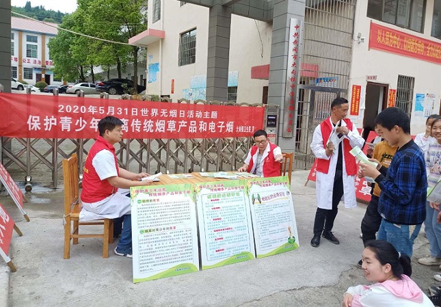 清风网讯(通讯员 陈杰 朱利斌) 2020年5月31日第33个世界无烟日,其活动主题是“保护青少年,远离传统烟草产品和电子烟”。为让师生和群众知晓世界无烟日,了解吸烟的危害以及控烟禁烟的重要性,维护人民群众健康,控制和减少吸烟危害,5月28日,武冈市大甸镇卫生院公共卫生科组织医务人员在大甸中学大门口开展“世界无烟日主题”健康宣传和咨询活动。