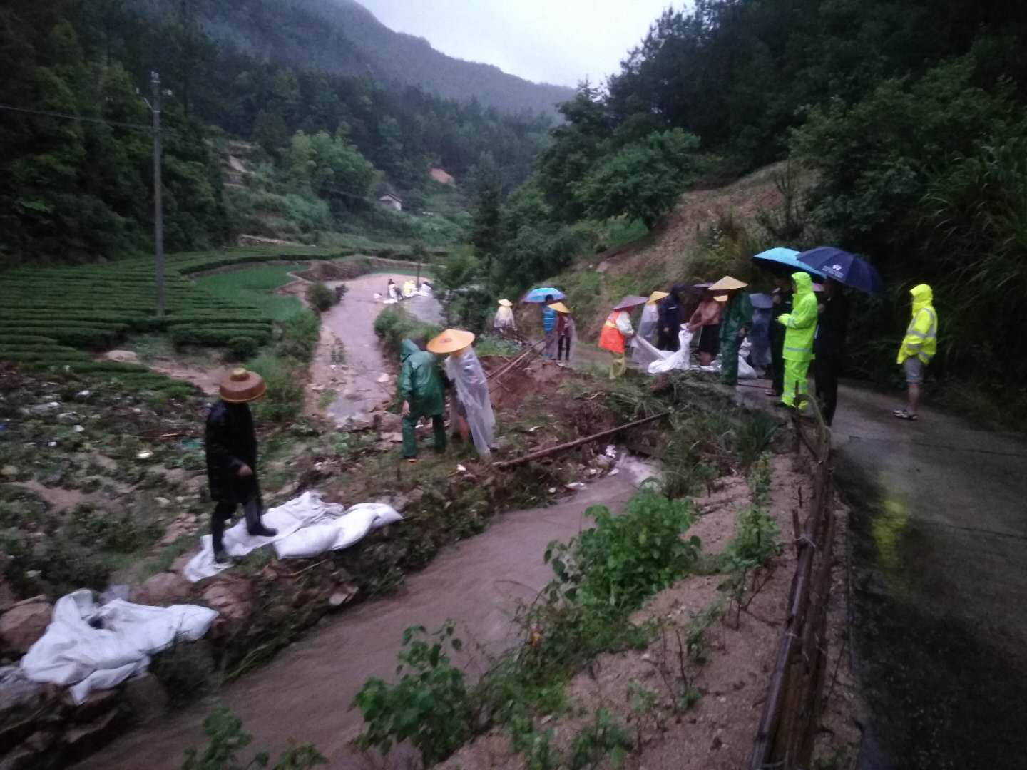 14日凌晨3点,英山县杨柳湾镇朱家坳村遭受了大暴雨的袭击(1小时之内71mm),多处发生险情。4时,该县防汛办主任杨晨曦、杨柳湾镇党委书记肖政权、镇人大主席凤元纪星夜迅急赶赴现场,雨中指导村民抢险。