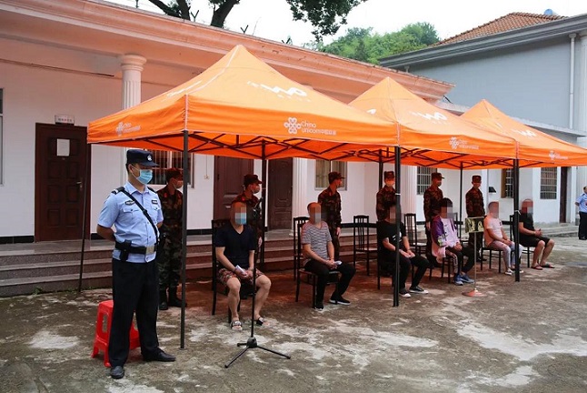 为确保这次审判顺利进行,英山法院多次召开专题党组会,做好各项准备工作,并及时通知相关部门干警及需要到场的所有人员做好核酸检测,确保安全。合议庭法官通过互联网,组织公诉人、辩护人、当事人召开了2次庭前会议,听取了控辩双方意见,对非法证据排除作出处理意见。要求所有参加审判人员及法警、民警、律师、当事人家属提前做好核酸检测,佩戴口罩。法警对进入人员逐一进行安全检查,测量体温,核对核酸检测结果。