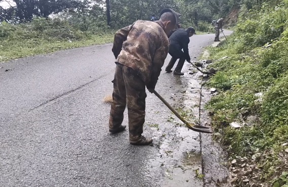 “清落石”。连续降雨的影响下,鲁史镇辖区部分地段出现塌方、落石的情况,形成了极大的安全隐患。清障工作人员对大块落石采取抱离路面、对小块碎石采取铲离路面、对细微石块采取扫离路面,实现道路平整无落石起伏。