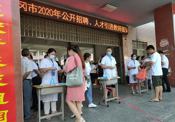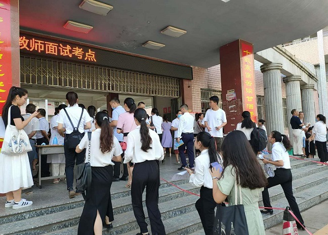 通过笔试筛选,教师招聘与人才引进面试工作在教学楼大门口紧张有序地进行,所有面试考生必须通过检测通道进行体温监测后方能进入考区,要求所有考生必须佩戴口罩,对没有自备口罩的考生免费发放,并对考生的随身物品进行统一归置、消毒与编号。
