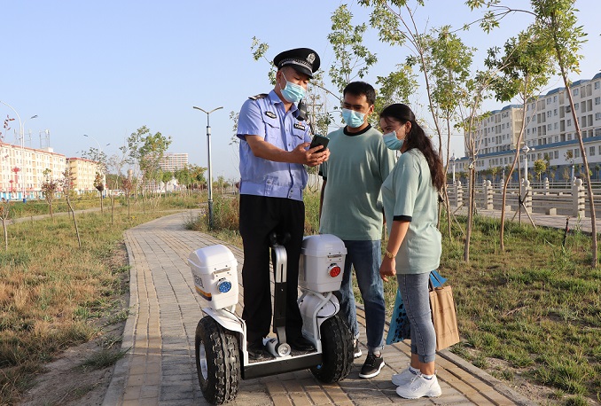 图3、图为阿瓦提县公安局民警学习使用警用平衡车开展街面巡逻及服务群众工作。