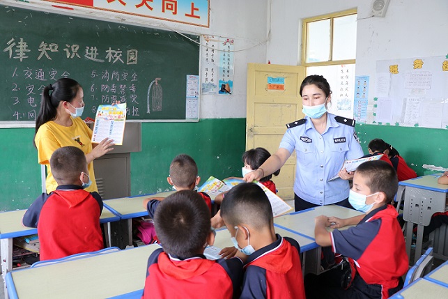 图1、图为新疆阿瓦提县公安局拜什艾日克派出所民警为拜什艾日克镇中心小学学生开展法制教育。