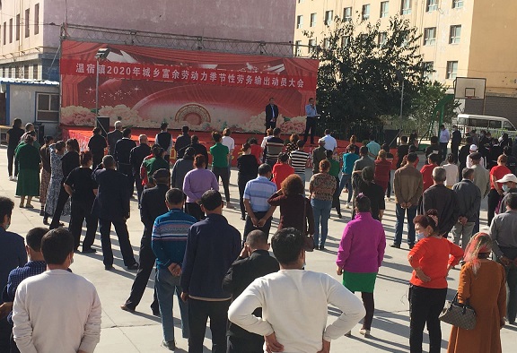这是温宿县今年组织的第一批外出务工创收的城乡富余劳动力动员大会。这次动员大会主要以城镇贫困户为主,希望他们外出务工以团结友爱、互帮互助,集体增收为主。外出带队的负责人承诺:要带领大家遵守各项规章制度好好干,力争达到“出去一人,致富一家,带动一片”的目的,动员和组织更多的村民走出家门,为实现全年增收目标和加快脱贫攻坚步伐积极努力。