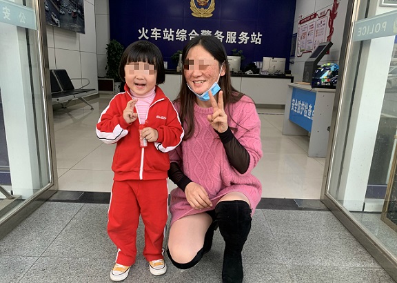 下午16时30分许,民警在巡视过程中,发现车站售票厅对面天桥底下有一名穿红色衣服,大约三、四岁的小女孩独自玩耍,身边也没有随行的父母。天桥上来来往往的人太多,民警初步判断其与父母意外走失,遂耐心询问小女孩及其父母的名字,家住哪里,奈何小女孩年龄太小,性格又比较内向,就是不开口说话。为舒缓小女孩的紧张情绪,民警立即到车站附近的蛋糕店买了一杯温热的奶茶,小女孩喝了一口,仍然不说话。沟通无果后,16时50分,民警带着小女孩到火车站警务综合平台请相关单位协助,平台民警到辖区九隆商场办公室,将手机上小女孩的电子照片,拿给工作人员钟某,询问是否有商户家的小孩走失。巧的是,钟某正是小女孩的姨夫。