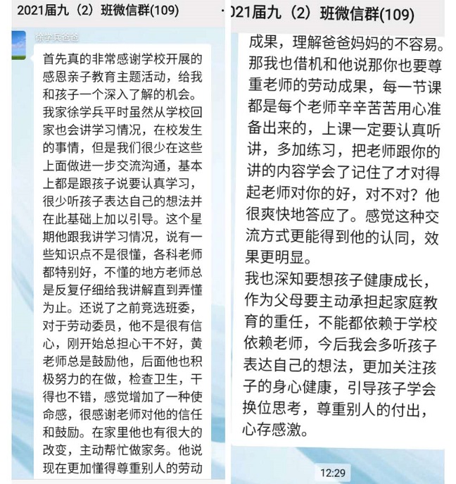 本学期以来,英山县杨柳中学政教处组织开展了家校合作周末亲子交流沟通德育主题教育活动,倡导学生每周六放假回家后,主动和家长面对面交流分享(留守儿童视频交流分享)一周以来的学校见闻、个人学习生活情况和学习心得,家长心平气和地耐心解答孩子的困惑和疑虑。家长在班级微信群里适时反馈孩子的可喜成长变化以及孩子回家交流分享的学校见闻(可长可短),班主任及时收集广大家长的反馈信息并打印留存,作为学生的成长档案。