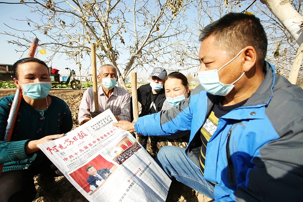 近日,新疆库车市以“驻村领导+支部书记+志愿者”的方式组成了宣讲队,通过书屋授课、院坝宣讲、视频短片等多种形式宣讲党的十九届五中全会精神。图为组干干部在哈尼喀塔木乡田间地头给村民宣传党的五中全会精神。