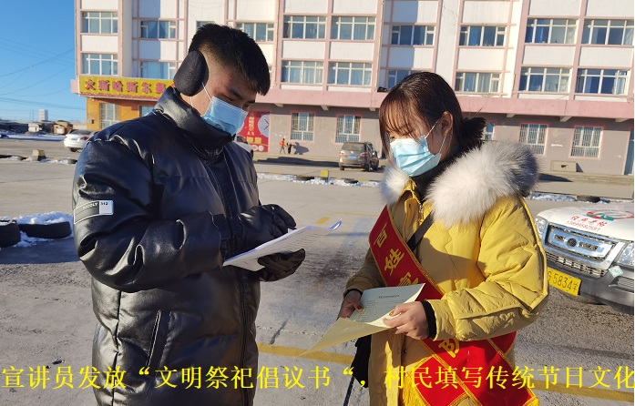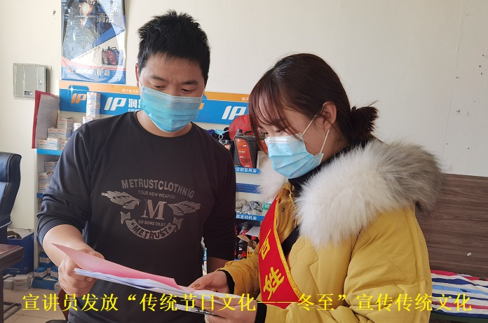 此次宣传活动,以实践所“百姓宣讲队”为主体、以广大村民为宣传对象,发放填写调查问卷,了解村民对传统节日的知悉程度,发放“冬至文明祭祀倡议书”和“传统节日文化——冬至”宣传单共两百余份。“百姓宣讲队”的宣讲员们,进入莫特格乡大小商铺、村民家中、乡幼儿园等人员集中场所发放倡议书和宣传单,为村民讲解冬至的由来和民俗活动形式,倡导村民重视传统节日,提醒村民在祭祀期间减少人员聚集、更新文明祭祀理念,多采用鲜花祭祀、网络祭祀、家庭追思等文明祭祀方式,同时引导村民发扬中华民族勤俭节约的优良传统,冬至多陪伴家中老人等。