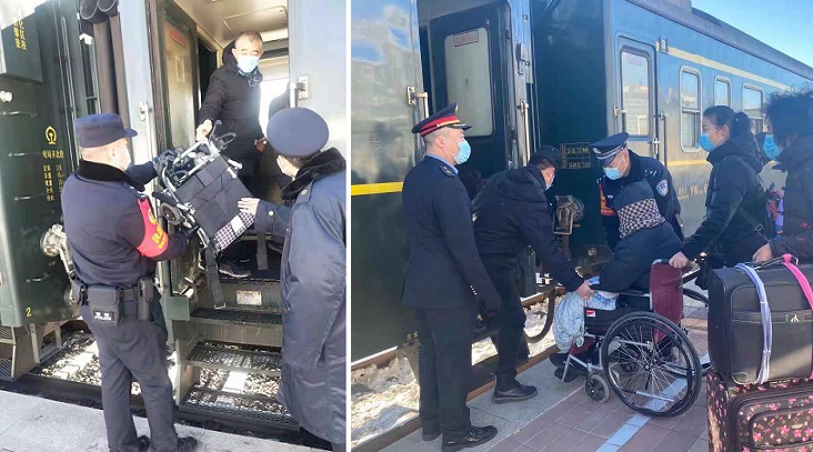 2月9日13时许,查布嘎车站派出所民警宋宇宁在候车室执勤巡逻时,发现一名乘坐轮椅的旅客行动不便,显得十分着急,于是上前了解情况。原来,该旅客是赤峰市阿鲁科尔沁旗人,准备前往通辽市看病就医,但由于行动不便,其与亲属赶到火车站时,眼看着所乘列车即将开行,亲属推着轮椅还提拿着随身行李,这让两人非常着急。了解情况后,民警迅速联系车站工作人员开辟绿色通道,推送轮椅一路将患病旅客送到站台上,随后又将他妥善安置到列车铺位上,并向列车长说明了两人特殊情况,嘱咐路上多加照顾,期间二人对民警的热情帮助连声感谢。