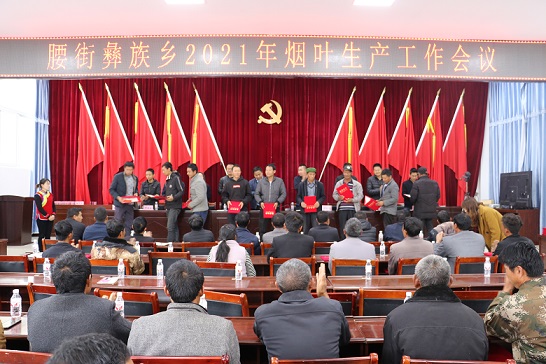 会上烟站站长作工作报告,提出今年烤烟生产建议;云南凤庆农村商业银行股份有限公司腰街乡服务站负责人对烤烟贷款政策进行宣传讲解;烤烟生产工作分管领导传达全县烤烟工作会议精神,通报全乡2020年烤烟生产工作责任目标完成情况,对2021年烤烟生产收购计划任务进行安排;为树立典型,对我乡优秀烟农、铁杆烟农、优秀烤烟技术员、烤烟先进工作者共计45人进行表彰。乡长与各村支书签订2021年烟叶生产责任状。