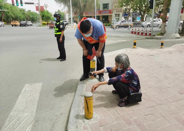 时值上班高峰期,正投入指引交通的执勤干警发现有一位年近七旬的老人在路边徘徊,执勤干警们遂上前进行询问。由于老人年龄大,口齿不清,且说话带有口音,双方交流起来较为困难,执勤干警们并未就此放弃,依旧耐心细致地询问老人,同时与老人的家人、亲戚进行电话沟通,最终了解到,原来老人要去其乃巴格社区附近的诊所看病,但由于语言不畅,一直打不到出租车,所以一直在路口徘徊。获悉这个情况后,志愿者们当下招停一辆出租车,与司机交代清楚去向、支付车款后,送老人上车安全离开,志愿者们又返回到执勤岗位。这前后不过一个小时的时间,就是这平常的一小时,却为我们的城市勾勒出一幅温馨的画面。