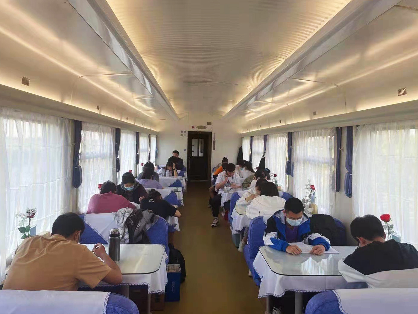 2021年6月5日,由包头开往大同的K620次列车上旅客熙熙攘攘,乘警石丽娜在车厢进行安全检查时,发现车厢里许多学生抱着书本在学习。仔细询问后得知,这些学生都是准备返回老家参加高考的考生,为了不浪费火车上的时间,他们选择在车厢里捂着耳朵继续学习。车厢里声音嘈杂,有广播的音乐声,有小孩的哭闹声,还有聊天的嬉笑声…见此情形,乘警石丽娜急中生智,第一时间找到列车长和餐车工作人员,妥善沟通后,本着一切为考生着想的原则,经过大家共同商量,决定将餐车设置成临时自习室,并通过广播邀请车上所有考生前来进行自习学习。几分钟时间,二十多位考生陆陆续续来到“列车自习室”进行学习。