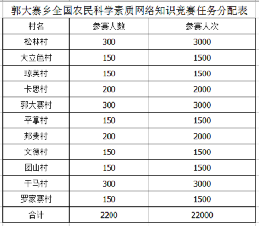 会上,乡党委书记杨涛同志要求:一是要提高认识。进一步增强做好农民科学素质网络知识竞赛工作的紧迫感,加大工作推进力度;二是要突出重点。瞄准乡村种植大户、家庭农场、专业合作社等重点人群,利用农业知识培训、入户等各种机会,加大宣传发动力度,促进农民科学素质网络知识竞赛活动有效开展,为提高农民科学素质作出更大贡献;三是进行合理分工。根据县级下达任务,郭大寨乡需完成参赛2000人,参赛20000人次,我乡根据各村现有人口数及重点人群数量,细化责任,任务分配至各村(派出所、卫生院等单位指定专人,切实组织好竞赛工作),要求以完成县级下达任务数为最低标准,高质量做好我乡农民科学素质网络知识竞赛工作。