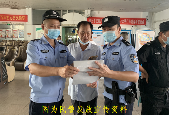 公安民警正在宣传电信防诈骗,提醒旅客群众不要向陌生人透露自己身份信息、银行卡信息,不向陌生人汇款、转账等,一旦发觉上当及时拨打110。