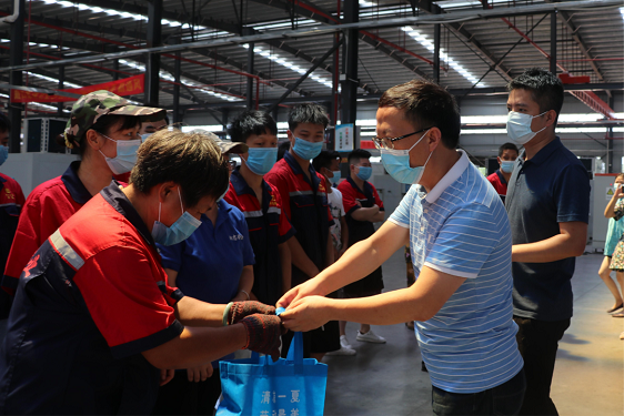 当天,谢跃东一行先后到湖南科瑞生物制药股份有限公司、湖南海旭管业有限公司、长鸿电子产业园、鸿鑫物业等企业,看望慰问企业一线员工,为冒酷暑、顶烈日、坚守在工作岗位的劳动者们送上解暑饮料、西瓜、藿香正气、花露水、毛巾、医用口罩等防暑降温物品,向他们表示诚挚的问候和衷心的感谢,并叮嘱他们做好疫情防控和酷暑自我防护。