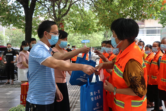 在鸿鑫物业慰问现场,谢跃东、戴花艳等把每一件慰问品递送到保洁员工手中,充分肯定他们为创卫创文、洁净城市所付出的辛勤劳动,嘱咐他们科学合理地安排保洁时间,尽量避开高温时段,减轻劳动强度,注意疫情防护和自我保护,保障自身安全和健康。