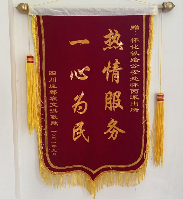 9月10日,喜获被骗订金的袁先生特地订制了一面“热情服务,一心为民”的锦旗,赶到怀化西站派出所,表达他的喜悦心情和对铁路民警的谢意。