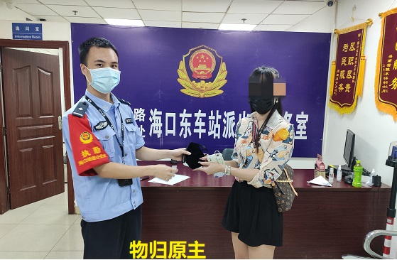 民警通过调阅列车上视频,发现该车保洁员在廖女士座位附近捡拾到一个黑色物品,与廖女士遗失的首饰袋相似。民警随即找到该保洁员询问,保洁员承认自己当天在座椅角落里捡到一个装有首饰的袋子,已交给失物招领处。民警立即联系失物招领处,经过核实,该首饰袋正是廖女士遗失的,9月23日,廖女士再次来到海口东车站派出所,在核对物品完好无误后,领回自己的首饰。据廖女士说,自己乘车途中仅打开一次行李箱拿了一条毛巾出来,随后也将行李箱上锁放好,应该是拿毛巾时不小心将首饰袋掉落。