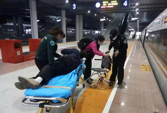 2021年10月8日17时30分,由清河站开往兴和北站的G2437次列车即将发车,一名旅客用担架推着一名行动不便的男子,急匆匆的走上站台。正在巡逻的乘警立即上前帮助该名旅客提拿行李,寻找座位。