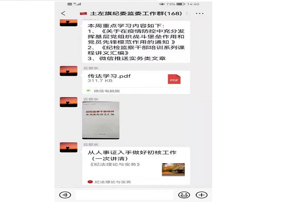 “疫情期间,为避免人员聚集,我们以部门为单位共同学习中央纪委17门课程讲义内容……”、“前几天观看视频课程如何办理职务犯罪案件时需要注意到这几点……。”土左旗纪委监委机关各部室及专案组干部正在结合业务工作开展分散式学习讨论。