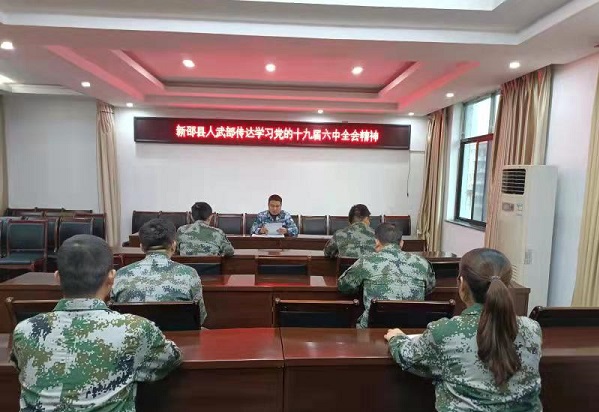11月15日下午,湖南省新邵县人武部组织全体干部、文职人员、职工原文传达学习了《中国共产党第十九届中央委员会第六次全体会议公报》,全面学习理解掌握全会精神。激励广大官兵把学习贯彻全会精神转化为爱军精武、爱岗敬业的强大动力,振奋精神、开拓进取、勇争一流,圆满完成年度各项工作任务。