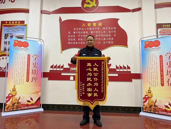 12月23日11时许,怀化火车西站派出所民警张军正在所里备勤,突然快递员喊他收快递。张军听了快递员的话后有点纳闷,最近没有网购物品,怎么会有快递的?但转念一想,认为可能是同学或战友寄来的新年挂历,他打开这个筒状快递一看,没想到竟然是一面锦旗,展开锦旗,只见锦旗上写着“真心为民办实事、人民公仆为人民”,落款是“韶山苏文赠民警张军”。张军看完锦旗上的内容后,想起了半个多月前自己在高铁列车上值乘的事情。