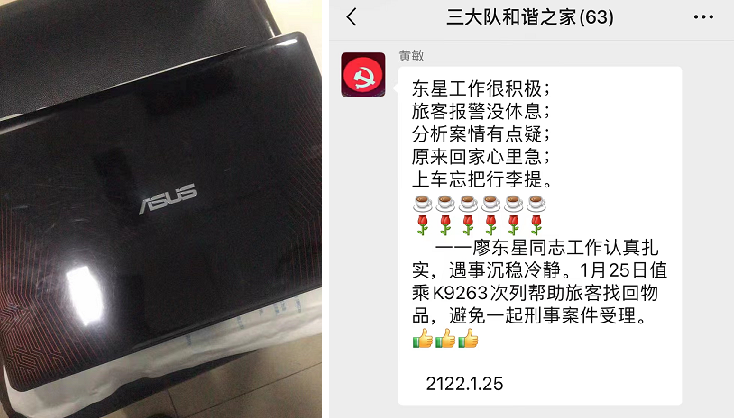 带着这个疑问,乘警又马上问了5号车厢的列车员,是否看到这个车厢独一人的旅客带没带电脑包?“我看到小伙子好像只拖着一个行李箱上车。”列车员的这个回答,让乘警心里有数了。于是请列车长胡志明与铜仁站联系一下,k9263次是否有旅客的遗留物品。铜仁站当即回复,候车室的座椅上捡到一个电脑包。列车长胡志明将铜仁站的电话回复转告乘警廖东星,且捡到的包内的电脑品牌与颜色都与这个小伙子报案的一致,旁边的小伙子听到后高兴不已,连说自己记错事情了。