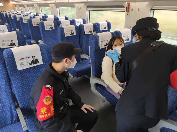 接报后,乘警立即赶赴现场进行处置,询问该女子其身份信息等相关情况。在询问过程中,女子拒不提供身份证,且无法道出自己的姓名、身份证号码等信息,女子一直喃喃自语,声称自己要去广州东,与所乘列车方向相反。女子全程语无伦次,眼神飘忽不定。乘警判断该女子可能精神不稳定,上错了列车,于是乘警将其带到餐车,不断安抚该女子情绪,并以朋友的方式与她聊起家常,希望可以得到有用的信息,最终该女子提供了其家人的联系方式。与其家人取得联系后,其家人十分担心她。