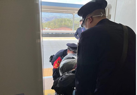 闻讯,乘警立即火速赶到事发处,发现一名男性乘客坐在3号车厢10D座位上,经乘警观察,发现该旅客面色苍白、身体无法行动。乘警询问该男性乘客情况,其告诉乘警其中风发作,导致身体无法动弹。因情况紧急,乘警李智当即通知列车工作人员广播寻医,并第一时间联系龙川西站,反映车内旅客身体情况,请求龙川西站准备轮椅或担架并联系120救护车。