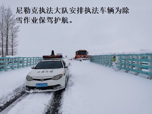 在除雪保通工作中,尼勒克执法大队督促公路经营性企业、公路养护单位在易结冰路段、大型桥梁等重点部位及时撒布融雪剂,出动清雪车清除公路积雪,安排执法车辆为除雪作业护尾保障。